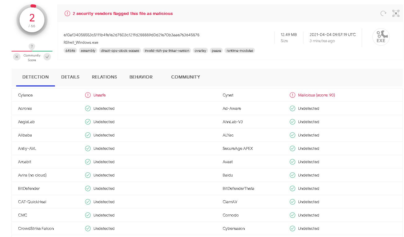 Ci siamo! Solamente 2 su 66 Engine di antivirus hanno “detec-tato” il nostro malware.