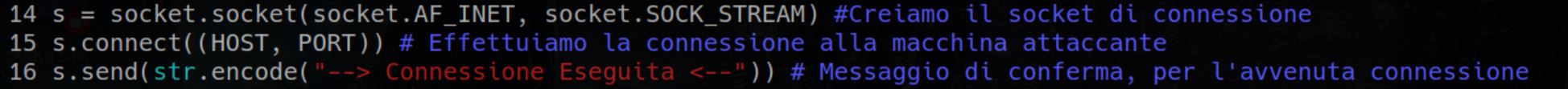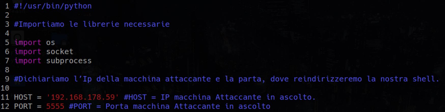 Il primo nostro passo sarà quello di scrivere la reverse shell in python, utilizzando la nostra macchina attaccante. Di seguito, trovate il codice commentato: