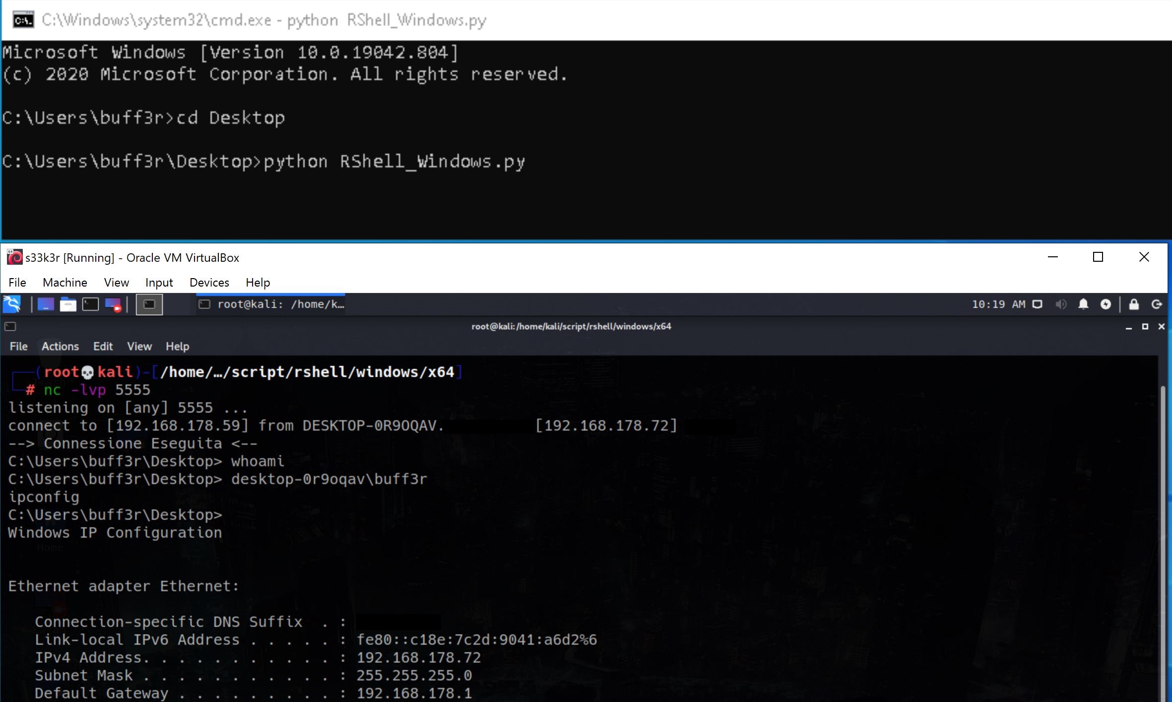 Preleviamo il file RShell_Windows.exe e prima di avviarlo spostiamoci sulla nostra macchina attaccante, mettendoci in ascolto con il comando: nc –lvp 5555