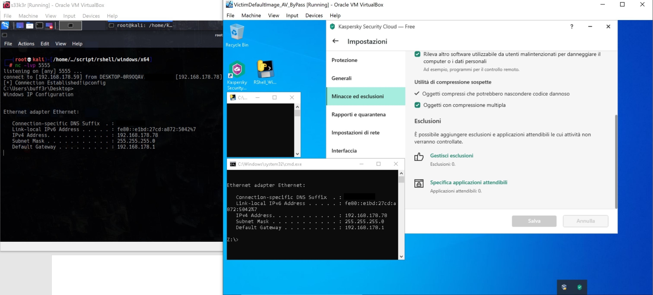 - Il nostro target, una macchina Windows 10x64bit aggiornata, con Kaspersky Security Cloud installato (anch’esso aggiornato), avente ip: 192.168.178.78