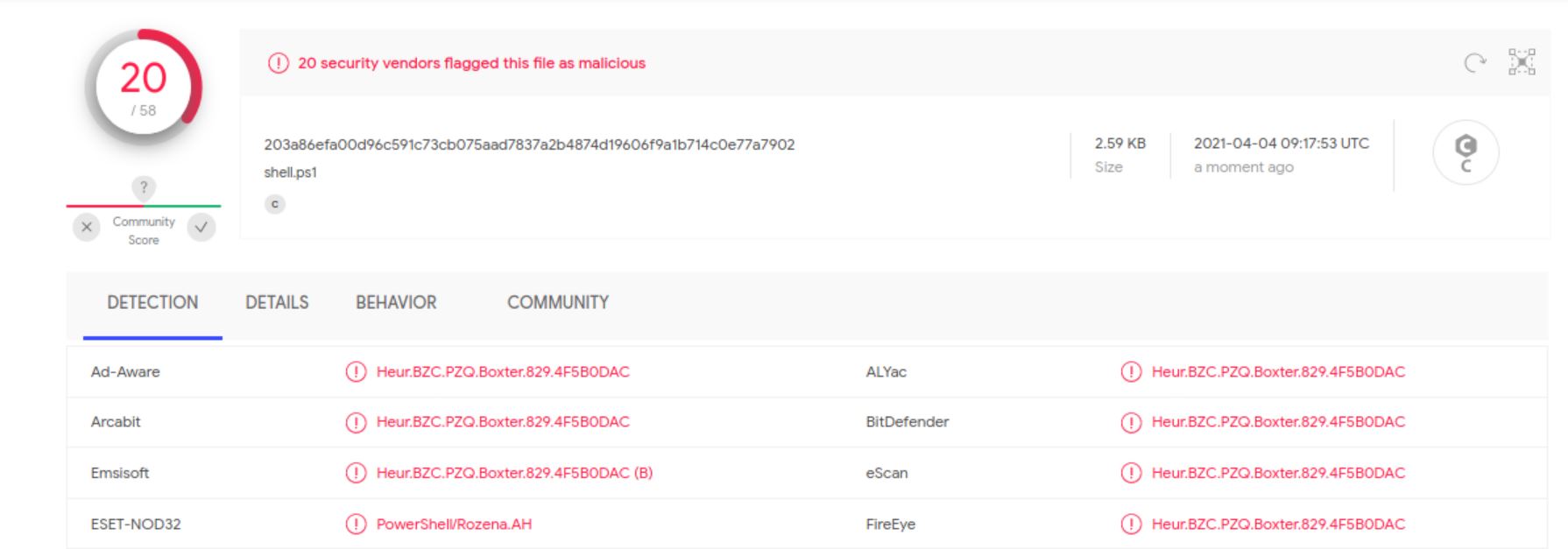 Ripetiamo adesso la verifica effettuata prima tramite VirusTotal. Noteremo che la lista di Antivirus che rilevano la nostra backdoor si è dimezzata, grazie al cambio di formato e al nostro encoder: ora sono 20 su 58.
