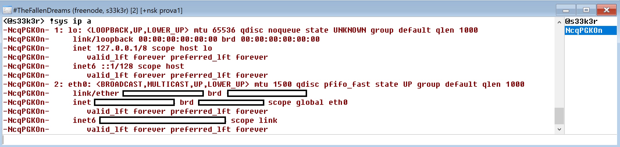 Procedendo in questo modo, tutti i nostri bot presenti nella chat eseguiranno il comando ip a (equivalente a ifconfig). Nel nostro caso, la risposta proverrà dall’unico bot connesso (il nostro server-bot).