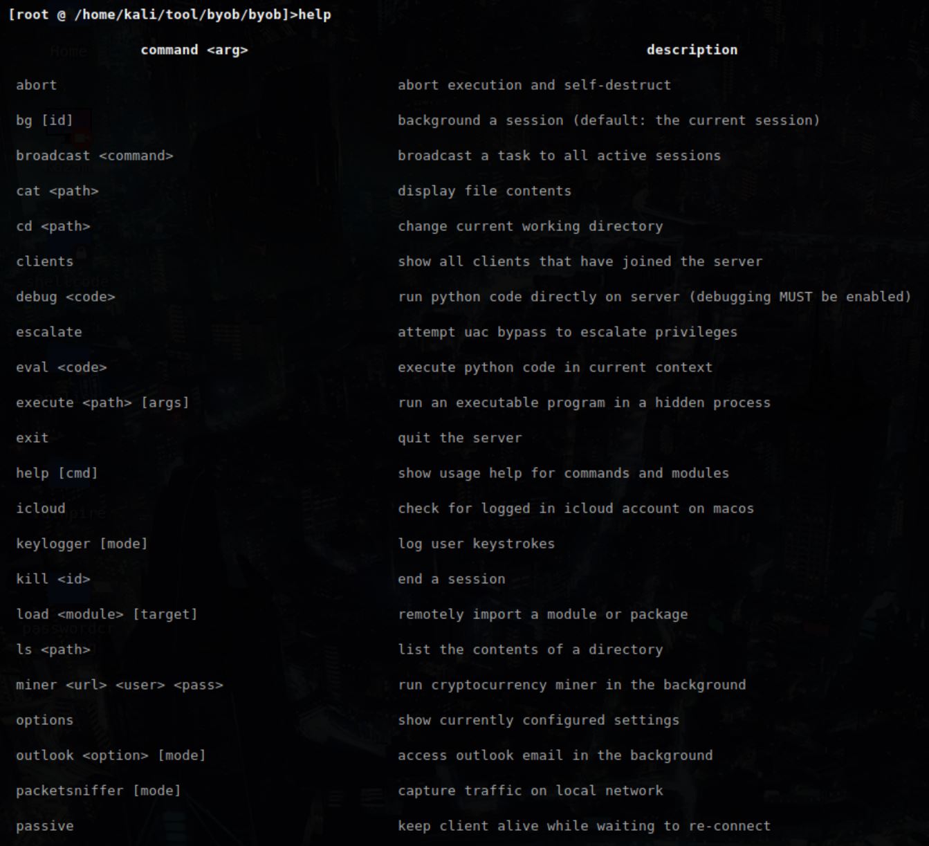 Volendo potremmo scegliere anche di utilizzare la Graphic User Interface (GUI). Per avviarla, è necessario tornare nella cartella /byob ed accedere alla directory /web-gui/ .